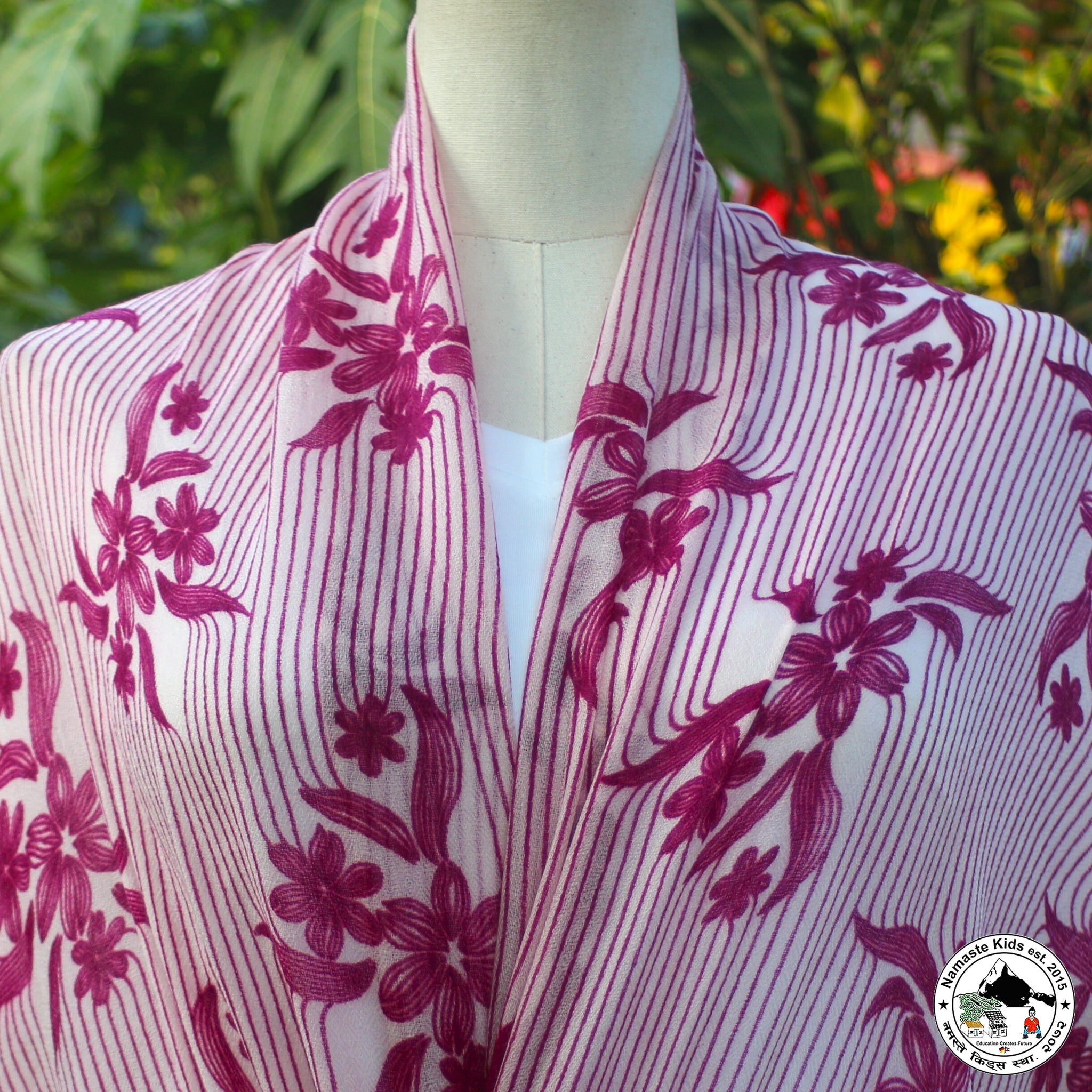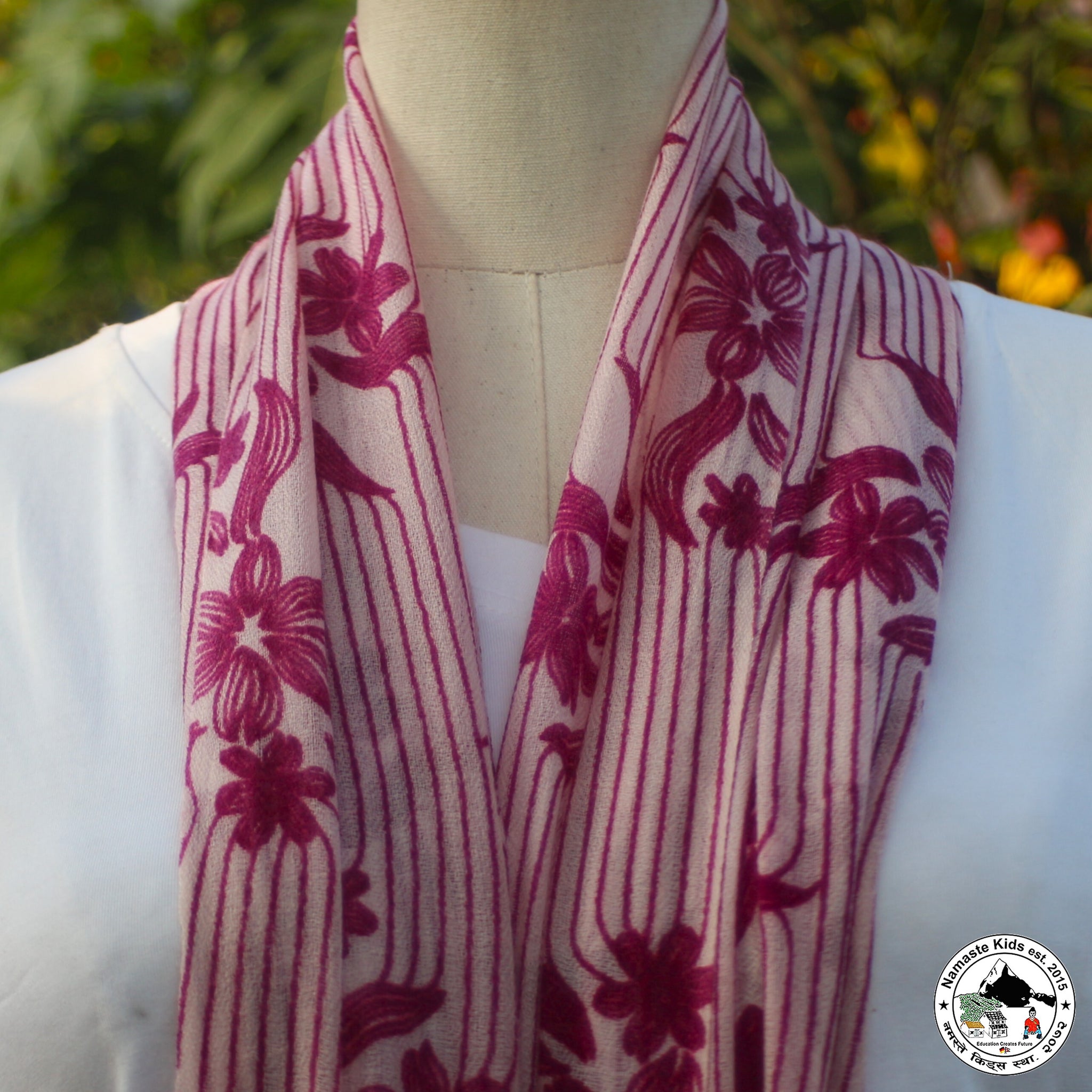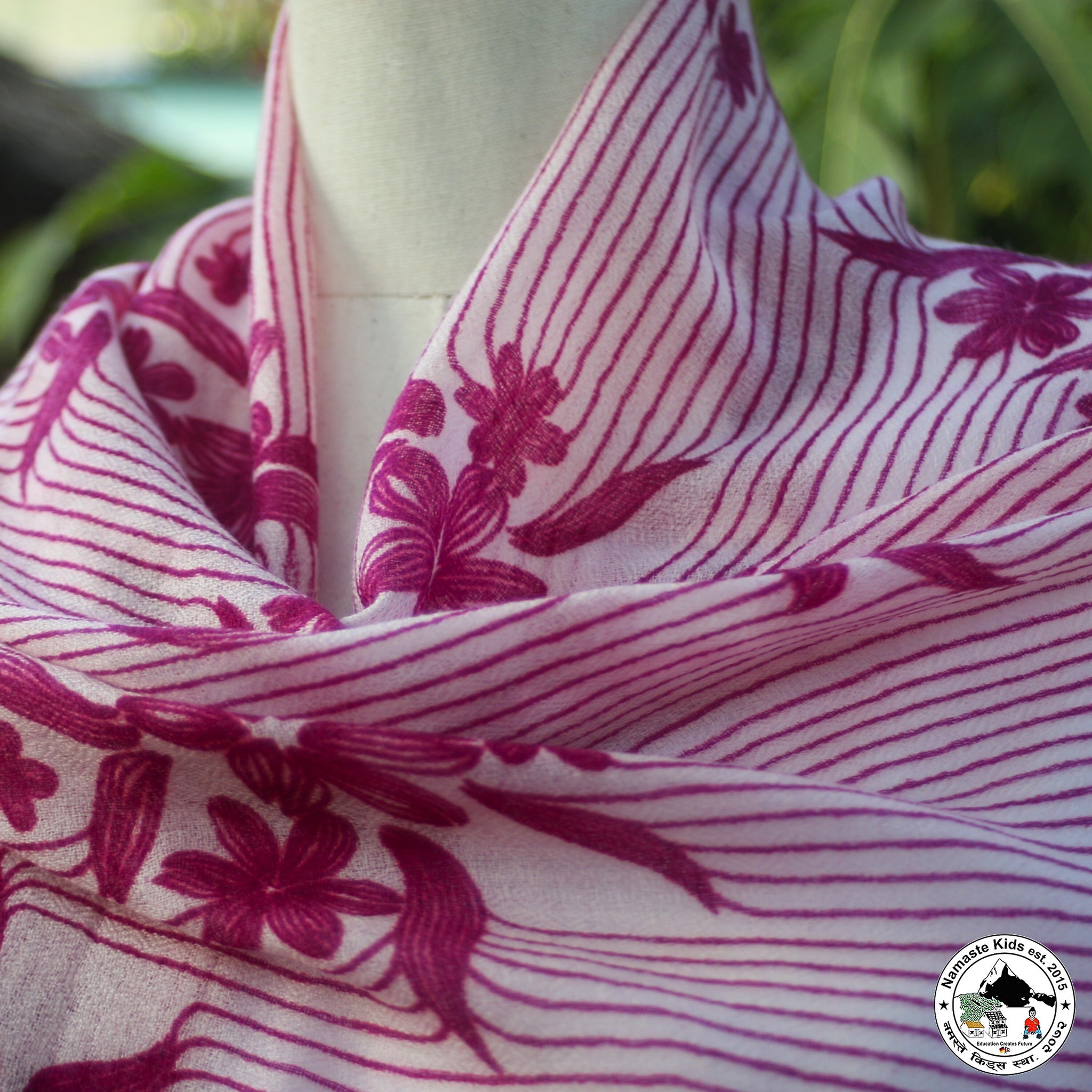 Dieser wunderschöne, zarte Schal aus Kaschmir- und Naturwolle kann durch seine Größe auch als Umhängetuch oder Stola verwendet werden.